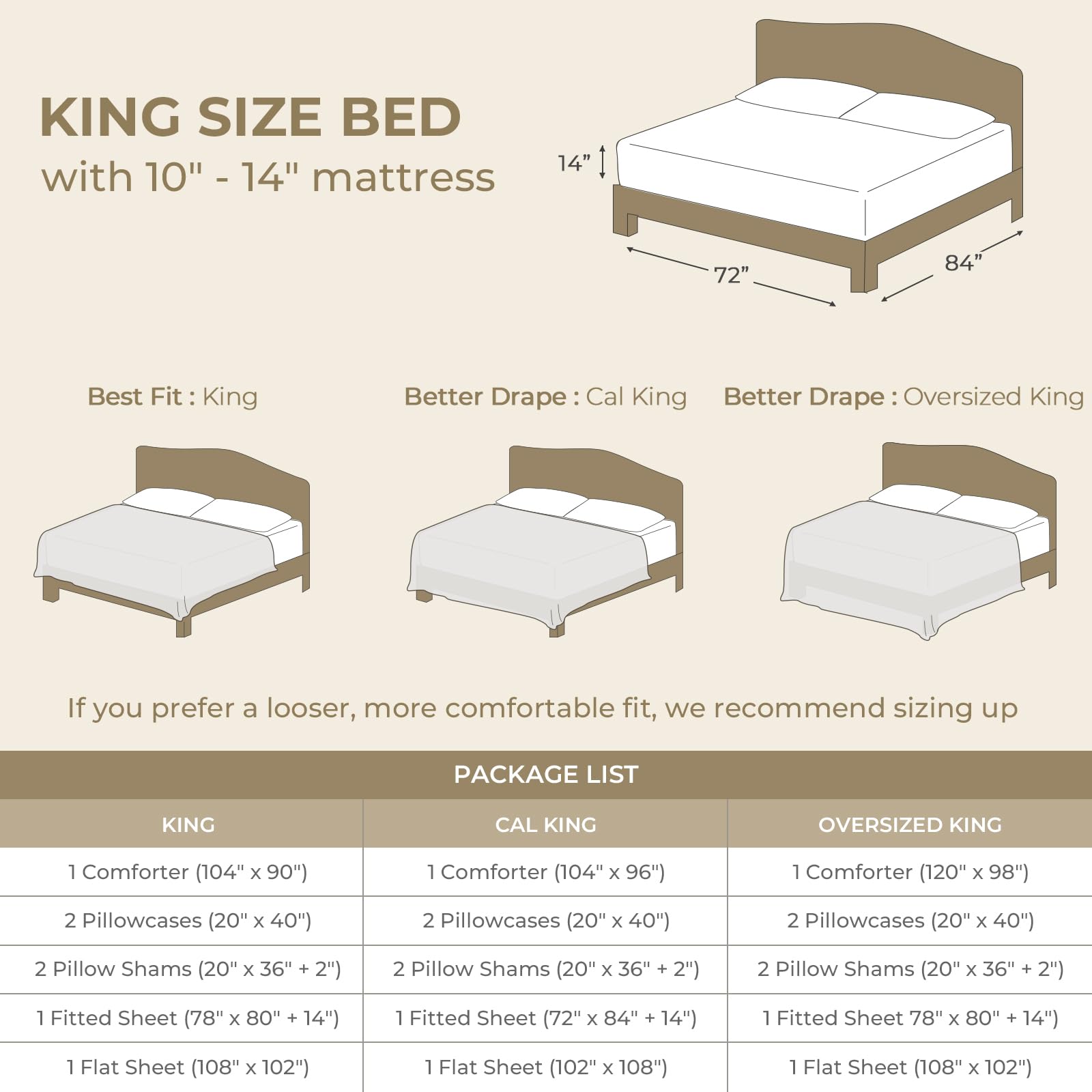 - What’s Included: The king size bed set includes 1 Comforter (104″ x 90″), 2 pillowcases (20″ x 40″), 2 Pillow Shams (20″ x 36″ + 2″), 1 Fitted Sheet (78″ x 80″ + 14″), 1 Flat Sheet (108″ x 102″); the set is packed in a vacuum bag; simply dry on low heat or gently fluff under the sun to restore its loft