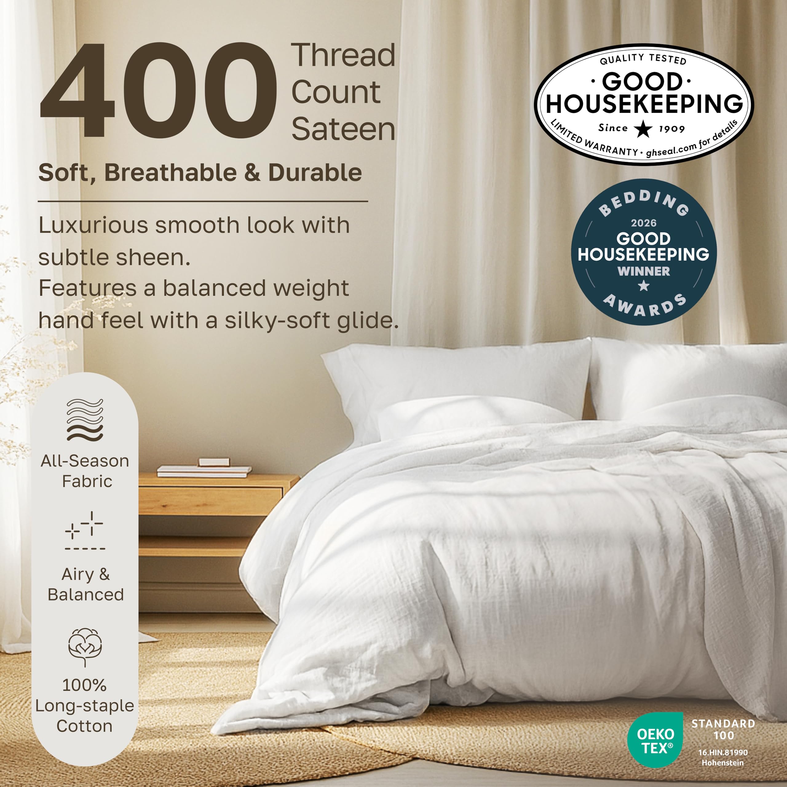 - Winner of the 2026 Good Housekeeping Best Bedding Award – Everyday Ease Cotton Sheets: Our 400 thread count queen size bed sheets are made with single-ply 100% long-staple cotton for a smooth hand feel and lightweight comfort. Independently tested to earn the prestigious Good Housekeeping Seal.