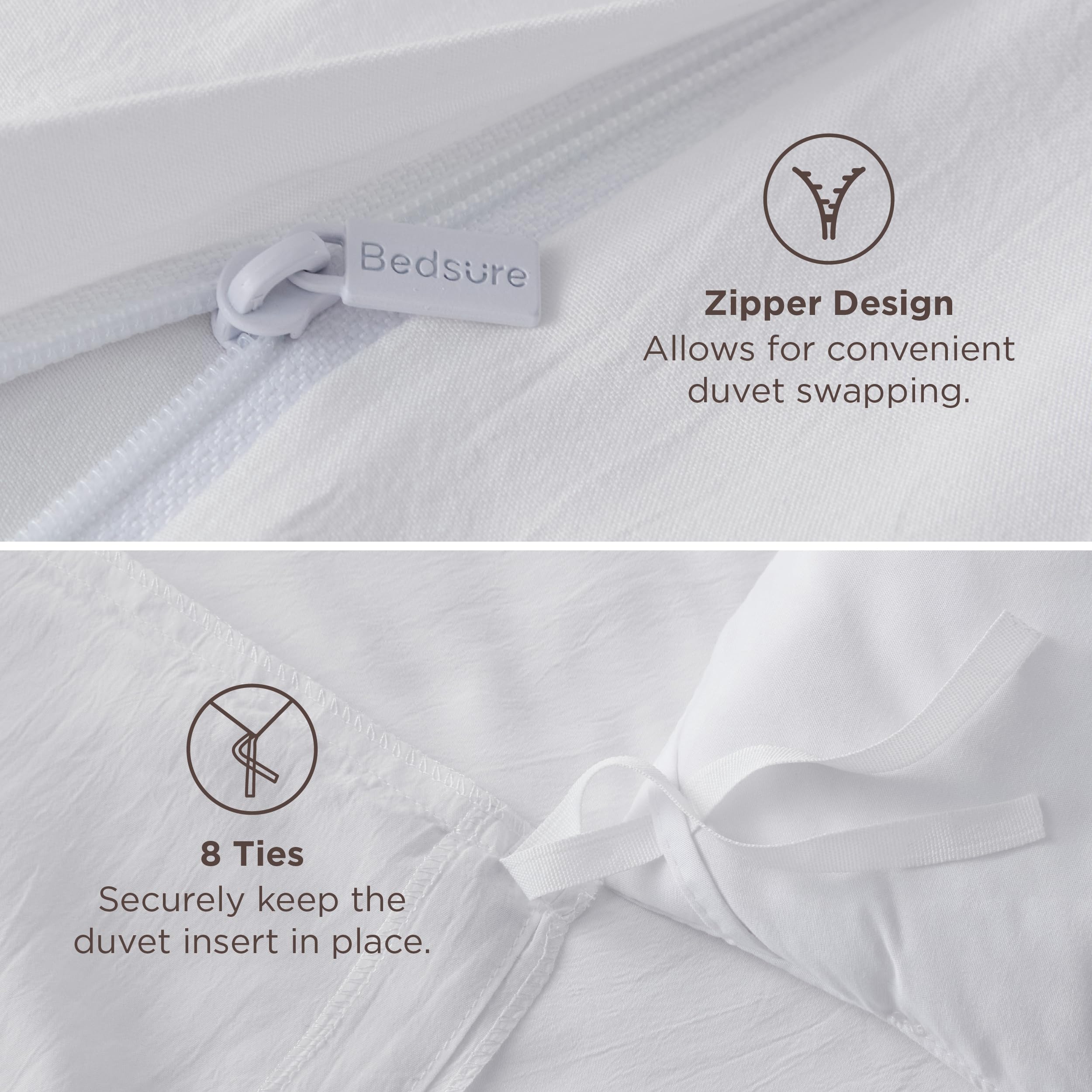 - Thoughtful Details: Eight corner ties inside the duvet cover ensure a secure fit to prevent the filling from bunching. The zipper allows you to seal off your comforter more quickly (and easily) than with a traditional button closure.